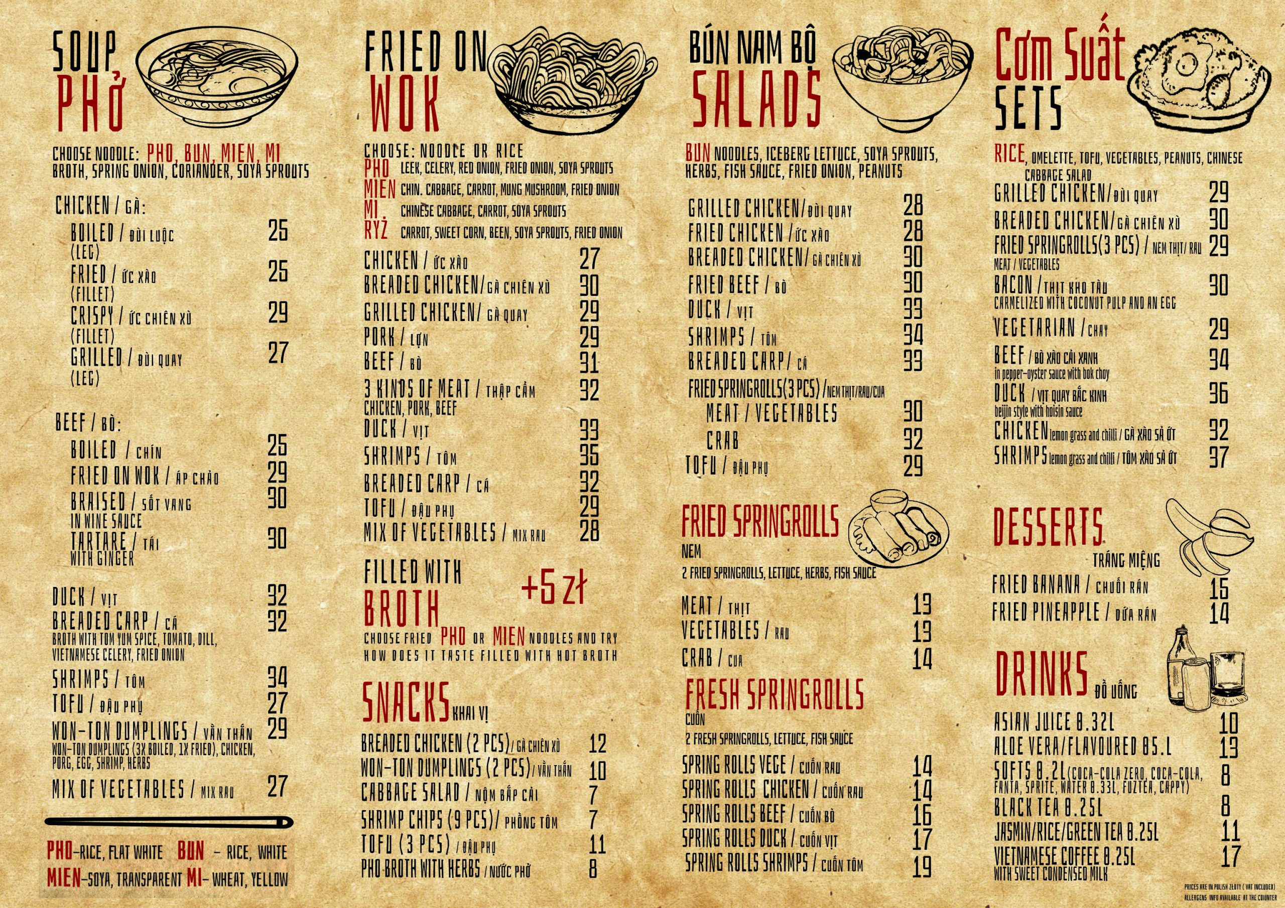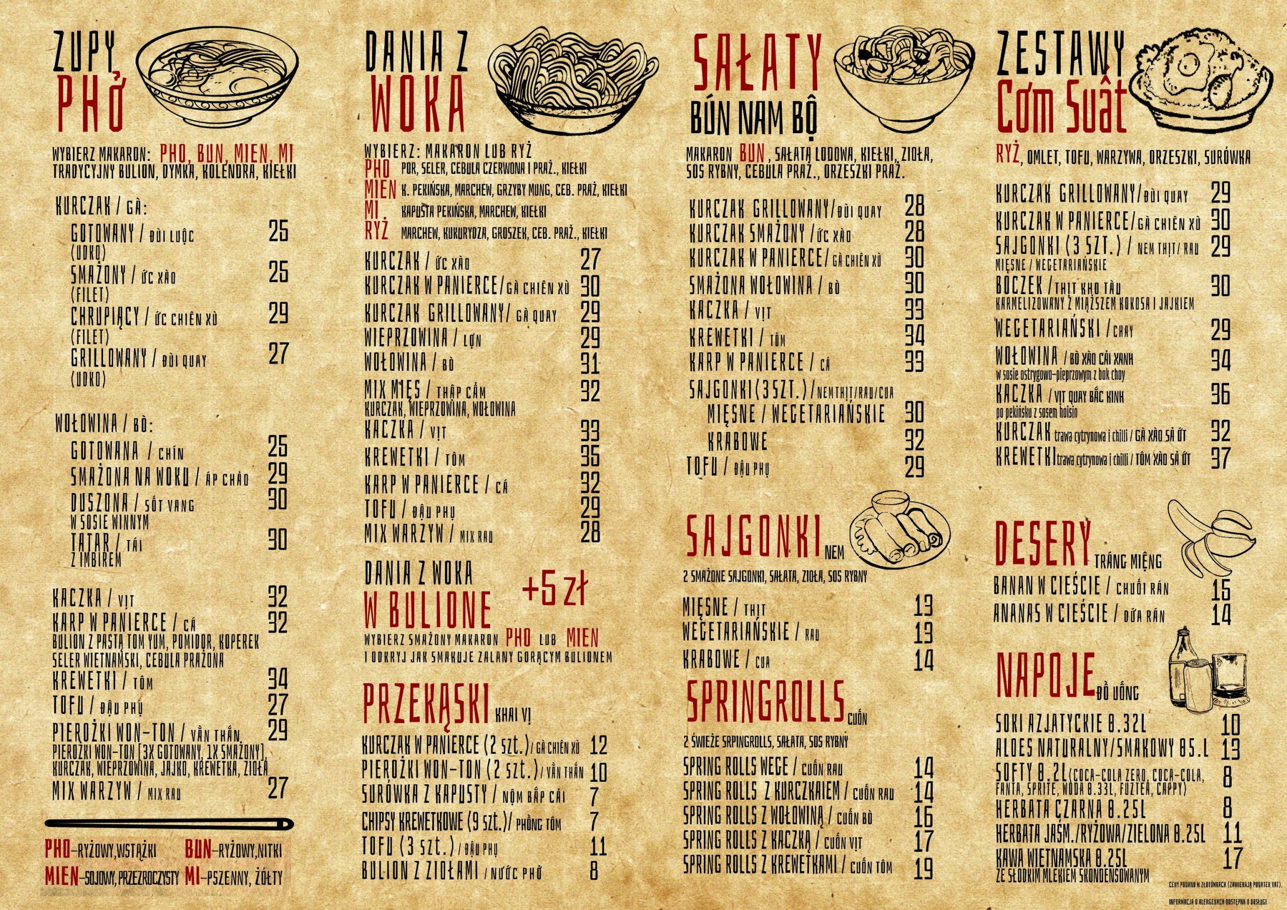 Mamy typowe wietnamskie klasyki jak: Zupa Pho, Sajgonki smażone, Springrollsy świeżo zawijane, przeróżne dania z Woka oraz sałatki Bun Nam Bo. Spróbujcie też naszych zestawów Cơm Suất oraz aromatycznej kawy wietnamskiej.